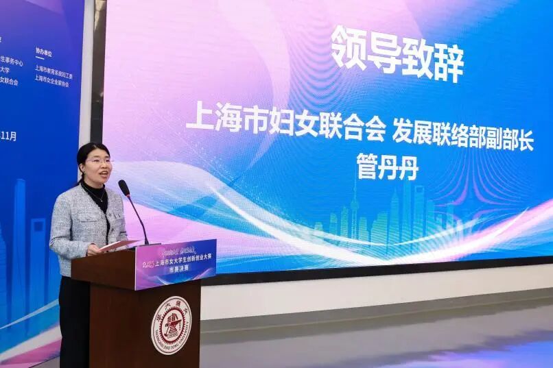 管丹丹为大赛致辞。她回顾了大赛五年来的丰硕成果,众多优秀项目在这一平台上实现从萌芽到成长的跨越,离不开政府、高校、企业与社会组织之间形成的协同合力。她强调,妇联组织将持续为女大学生创新创业赋能聚力、链接资源,做她们追梦路上最坚定的支持者与同行者。